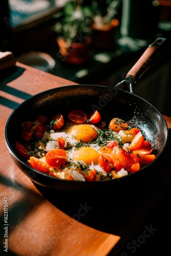 egg, tomatoes, frying pan, cooking, countertop, sunlight, culinary, breakfast, cosy, meal, food preparation, household, herb, vegetable, brunch, heat, texture, frying, culinary arts, flavorful, nourishment, cookery, freshness, rustic, home cooking, healthy eating, pot, pan, domestic life, dining, kitchen utensile, organic, vegetarian, receipe, tasty, savoury, seasoning, warmth