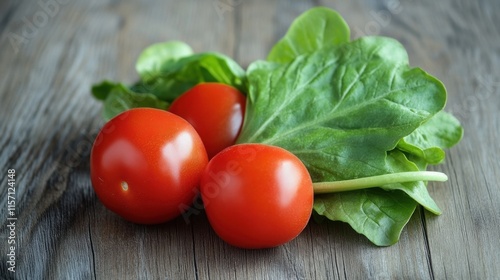 Fresh tomatoes and leafy greens on rustic wooden table