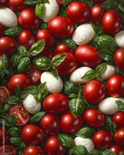 Fresh Tomatoes and Mozzarella with Basil Leaves Background Design