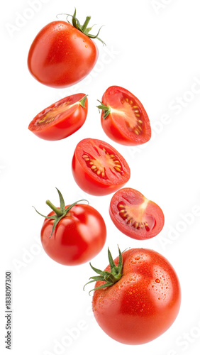 Fresh tomatoes in various cuts and whole falling isolated on transparent background