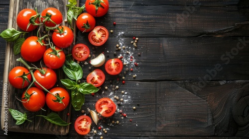 Fresh tomatoes with basil leaves on rustic wooden surface