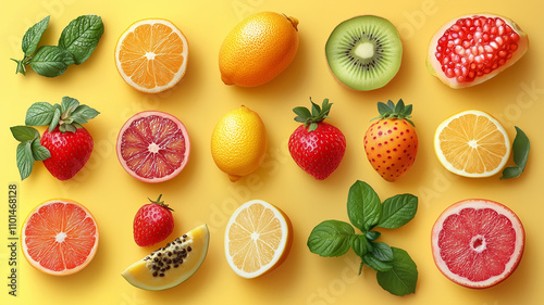 tropical fruit, yellow background, topview, fresh, citrous, strawberry, kiwi, pomegranate, mint, orange, lemon, papaya, grapefruit, vibrant, healthy, summer, colourful, ripe, juicy, sweet, natural, organic, dessert, snack, nourishment, arrangement, food, freshness, exotic, berry, slice, tropical, green, red, yellow, healthy eating, vitamin, diet, refreshing, seasonal, epicure, delicious, aesthetic, bright, food photography, fruit salad, culinary