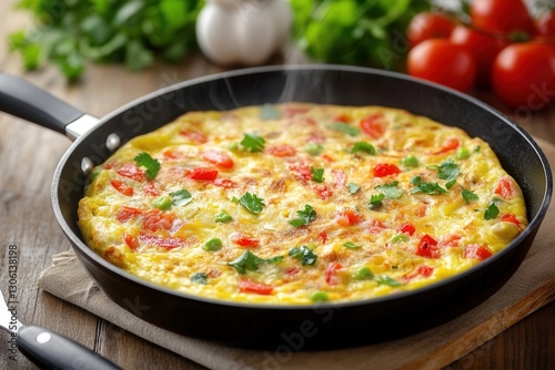 Fresh vegetable frittata with tomatoes and herbs cooking in black cast iron skillet on wooden surface