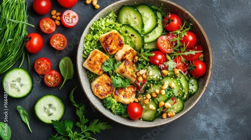 salad, vegetable, chicken, tomatoes, cucumber, greener, cookery, healthy, food, meal, garnish, nourishment, cooking, epicure, organic, green, diet, fresh, herb, lettuce, ingredient, bowl, presentation, colourful, delicious, culinary, protein, vegetarian, snack, fiber, vitamin, dish, favor, summer, receipe, seasonal, homemade, preparation, tasty, dining, culinary arts