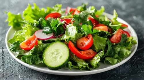 Fresh vegetable salad with lettuce, tomatoes, cucumber, and radishes on white plate