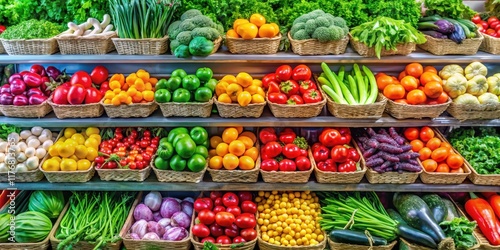 Fresh vegetables arranged on a supermarket shelf with vibrant colors and varying shapes, offering an assortment of options for healthy meals , grocery store, fruit selection