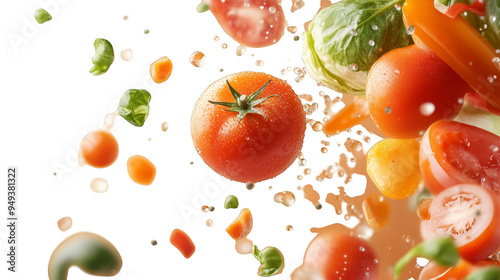 Fresh Vegetables Splashing in Water Tomatoes Bell Peppers Basil and Cabbage