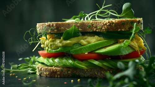Fresh veggie sandwich with avocado, tomato, and greens on whole grain bread.