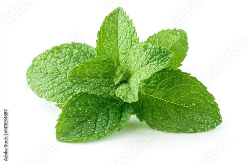 Fresh, vibrant mint leaves with visible dew drops, isolated on a white background