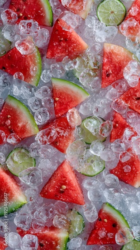 Fresh watermelon slices and lime rounds chilling on a bed of ice cubes