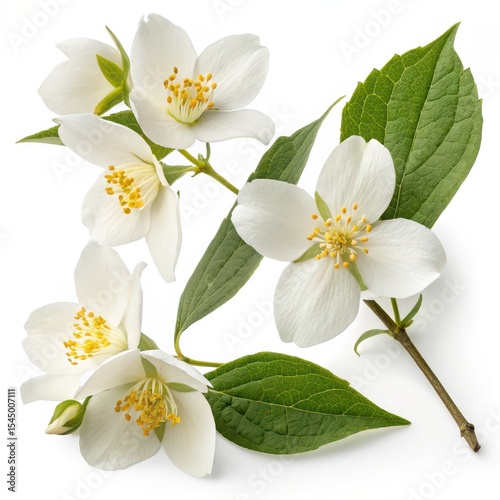 Fresh white jasmine flowers with vibrant green leaves on white background, symbolizing purity, fragrance, and natural beauty.