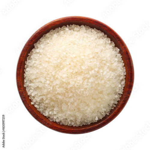 Fresh white rice in wooden bowl, perfect for cooking and meal preparation. This staple food is essential in many cuisines around world, offering versatility and nourishment