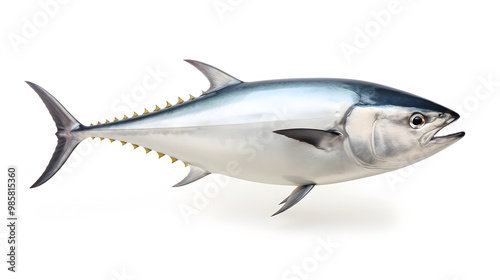 Fresh whole tuna fish with glossy silver skin isolated on white background