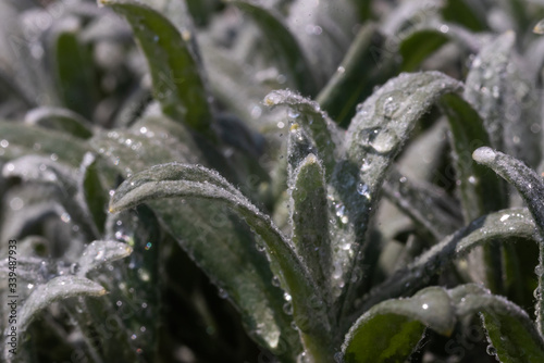 Fresh wooly green spring grass with drops. Lawn behind a sunny lawn. The nearest grass blades and glow with yellow light. Good morning. Macro background with copy space.