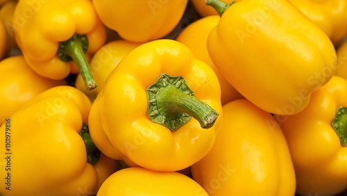Fresh yellow bell peppers with glossy skin and vibrant green stems