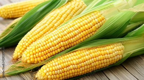 Fresh yellow corn cobs with green leaves on a wooden surface.