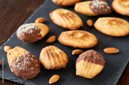 Freshly baked almond cookies on stone board over wooden background, top view, selective focus.