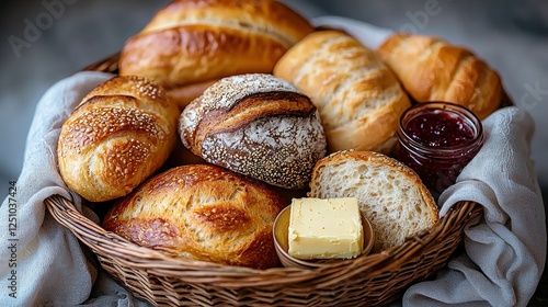 Freshly baked assortment of bread rolls with butter and jam in a rustic basket