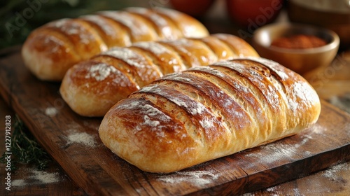 Freshly Baked Bread Loaves on a Wooden Cutting Board in a Rustic Kitchen Setting Surrounded by Ingredients and Spices. Generative AI