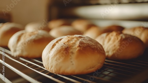 Freshly baked bread rolls cooling on a rack, showcasing a golden crust and soft interior. Perfect for culinary themes.