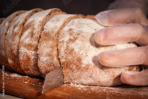 bread, fresh, baking, flour, slice, knife, hand, cookery, breakfast, aroma, homemade, healthy, food, kitchen