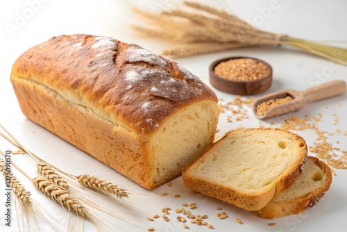 loaf, bread, wheat, brown, baked, fresh, background, white, food, bakery, healthy, grain, crust, rustic, artisan, homemade, slice, diet, nourishment, natural, organic, whole, meal, breakfast, lunch, dinner, snack, delicious, epicure, traditional, simple, plain, studio, isolated, closeup, macro, texture, porous, gold, warm, aroma, flour, dough, oven, eat, cut, piece, single