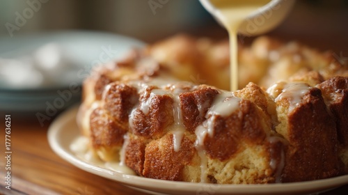 Freshly baked bundt cake on a white plate. the cake is golden brown in color and has a crumbly texture. it is drizzled with a white glaze, which is being poured over the top of the cake.