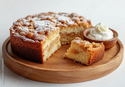 Freshly Baked Cake with Powdered Sugar and Creamy Topping on Wooden Board, Perfect for Dessert or Celebration in Minimalist Style