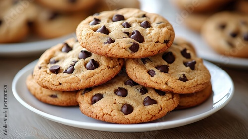 Freshly baked chocolate chip cookies on a white plate with a perfectly golden brown texture