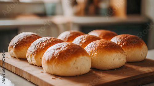 freshly baked golden bread rolls with a soft, glossy crust, lined up on a kitchen