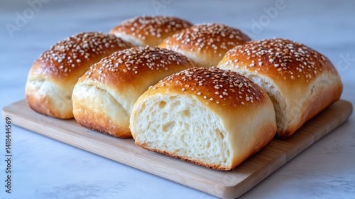 Freshly baked golden brioche rolls on a wooden tray, close-up view with soft focus background, and artisan bakery concept with natural light.