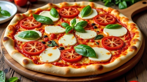 pizza, epicure, crust, tomatoes, mozzarella, basil, fresh, wooden board, vibrant, meal, cooking, eatery, delicious, culinary, dining, savoury, herb, cheese, food, feast, snack, traditional, italian, preparation, seasoning, favor, kitchen, cookery, bistro, presentation, enjoy, share, slice, visit, warm, inviting, bright, colourful, produce, handcraft, artisan, plate, eatery