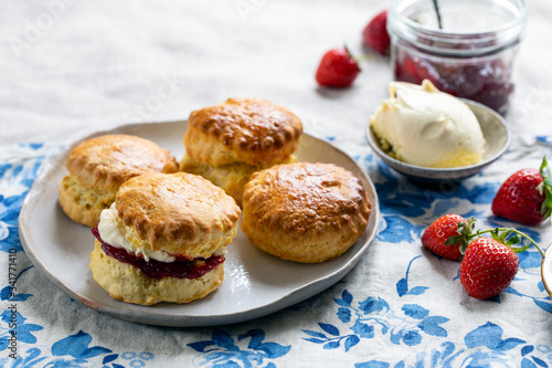 scone, food, jam, strawberry, marmalade, preserve, cream, devon, cornwall, english, british, traditional, britain, sweet, bake, baked, fresh, pastry, bread, snack, afternoon tea, cookery, england, great britain, typical, homemade