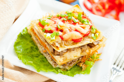 lasagna, lasagna, pasta, italian, cheese, mozzarella, mushroom, tomatoes, pepper, onion, lettuce, vegetable, hot, baked, green, red, dish, plate, fresh, sauce, sliced, cut, ingredient, garnish, vegetarian, juicy, food, homemade, italy, mediterranean, portion, traditional, epicure, lunch, dinner, cooked, healthy, meal, tasty, nourishment, nutrient, alimentary, spice, yellow, closeup, horizontal