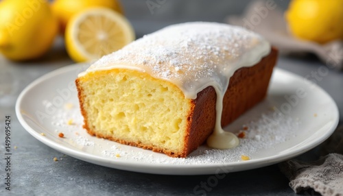 Freshly baked lemon loaf cake with sugar icing on white plate. Homemade bakery dessert, sweet food, ready-to-eat snack for brunch, breakfast. Rustic food photo, isolated on stone surface. Citrus