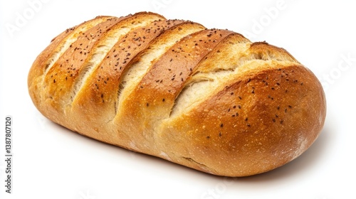 Freshly baked loaf of bread with a golden crust and sliced top, showcasing a delicious texture and inviting aroma.