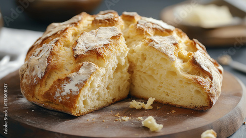 Freshly baked loaf of bread with a golden crust on a wooden board.