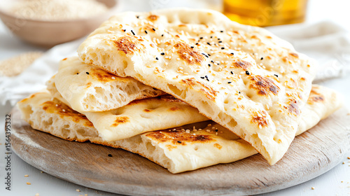 Freshly baked naan bread stacked on a wooden board, garnished with spices, perfect for any culinary delight.