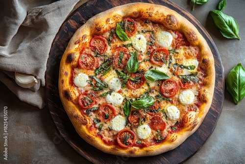 pizza, tomatoes, mozzarella, basil, cheese, herb, fresh, baked, crust, round, wooden board, italian, dish, food, savoury, meal, closeup, cookery, epicure, rustic, delicious, cheesy, vegetarian, green leaf, appetising, flavorful, cooking, dinner, healthy, table setting, food photography, natural light, ingredient, organic, seasoning, colourful, plate, served, traditional