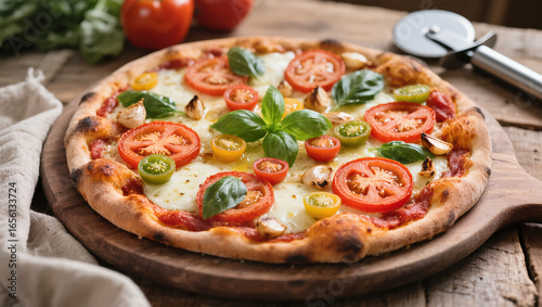 Freshly baked pizza with tomatoes, basil, garlic and melted cheese served on wooden board in rustic kitchen setting.