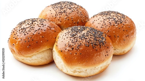 Freshly baked poppy seed buns arranged in a cluster against a white background with Copy Space.
