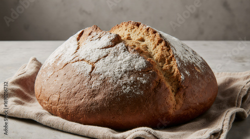 Freshly baked round loaf of bread on cloth with rustic background