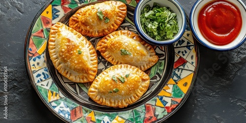 Freshly Baked South American Empanadas Served on a Colorful Plate with Dipping Sauces