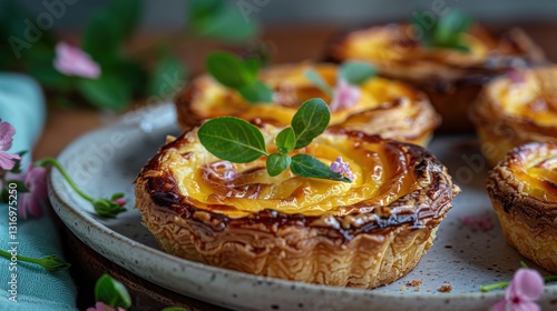 Freshly Baked Tart with Creamy Filling and Edible Flowers on Rustic Plate