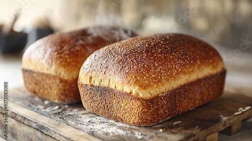 Freshly Baked Whole Grain Bread on Rustic Wooden Board with Golden Crust and Delightful Steam