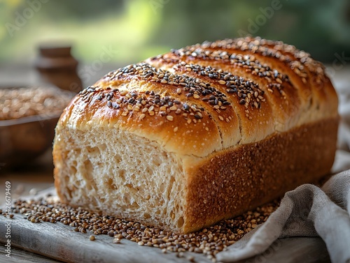 Freshly baked whole grain bread with a golden crust and scattered seeds