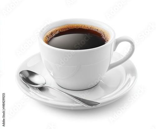 Freshly Brewed Coffee in a White Porcelain Cup with Spoon on a Saucer Isolated on White Background for Beverage Concept