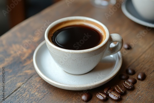 Freshly Brewed Coffee in White Mug on Wooden Table with Coffee Beans
