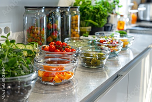Freshly chopped vegetables displayed in clear bowls