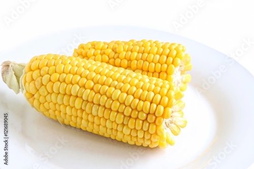 sweet corn, corn, food, grain, vegetable, ingredient, snack, fresh, cooked, boiled, steamed, yellow, alimentary, healthy, organic, nature, natural, cob, juicy, shiny, plate, china, white, closeup, studio shot, no people